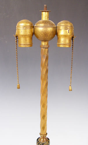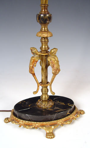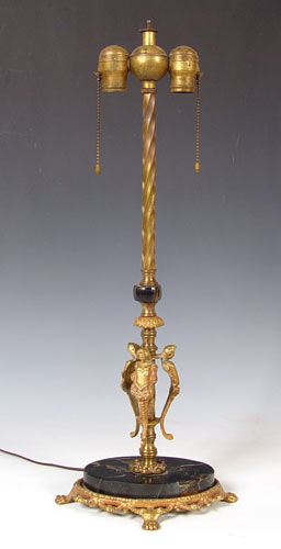 FRENCH GILT BRONZE AND MARBLE TABLE LAMP: Black marble and gilt bronze join for a decorative early 20th C. lamp. An oval paw foot base supports a trio of telemones (male caryatids). Two sockets. 24''h., 9 1/2'' long base.
