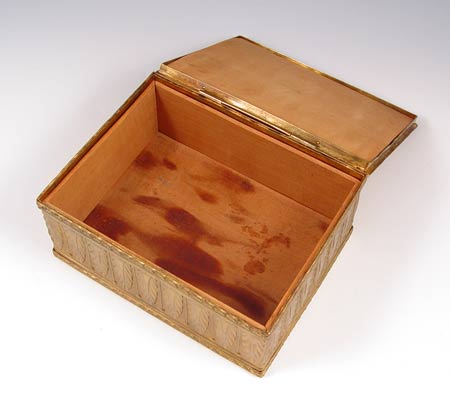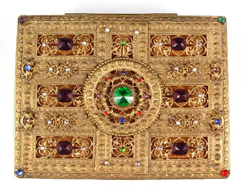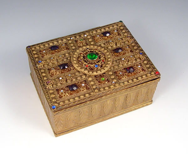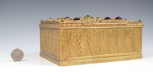 AUSTRIAN ETRUSCAN STYLE ''JEWELED'' BRASS BOX: The hinged lid decorated with faceted and cabochon gemstone colored stones. Impressed ''Austria'' on the underside. 2 3/4''h. x 5'' x 6 1/4''.
