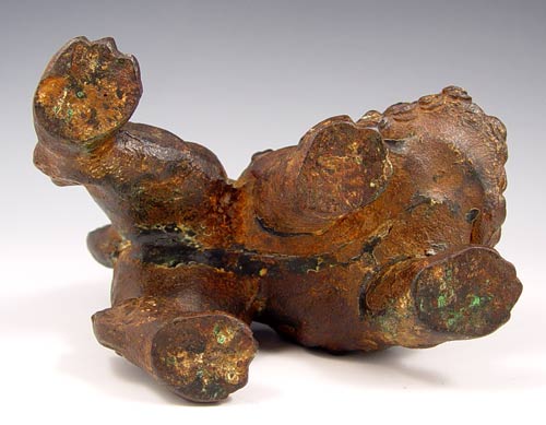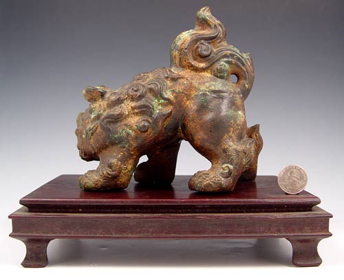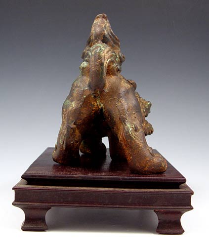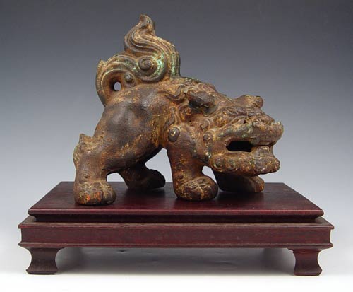 CHINESE METAL FOO DOG: Traces of polychrome paint remain. Measures 6 1/4'' high x 7'' x 5''. On wood stand, measures 2 1/4'' high x 9 3/4'' x 6 5/8''