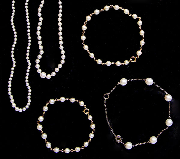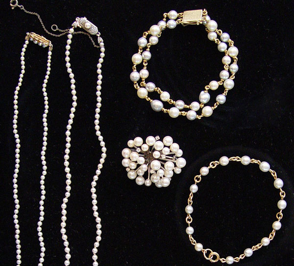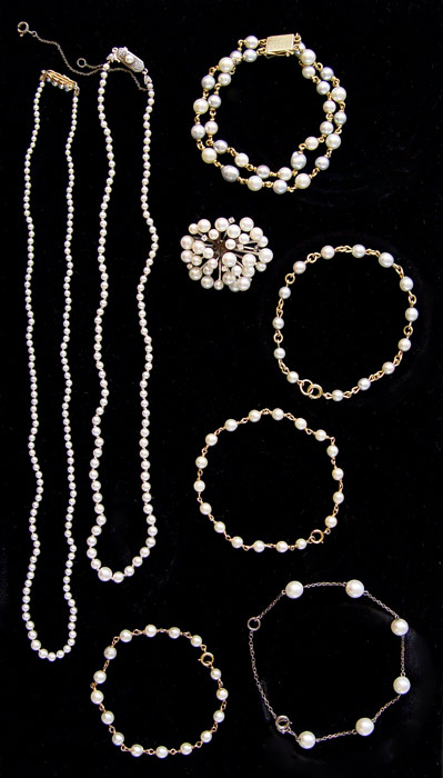 ESTATE COLLECTION OF CULTURED PEARL JEWELRY: 8 pieces of cultured pearl jewelry as follow: 1) Sterling starburst brooch, 18'' graduated strand with SS clasp. 2) Sterling bracelet with 5 7.00 mm pearls. 3) 20'' graduated strand with GF clasp. 4) 14K double strand bracelet, 5) 6-7) pair of 14K single strand bracelets and 8) one GF bracelet.