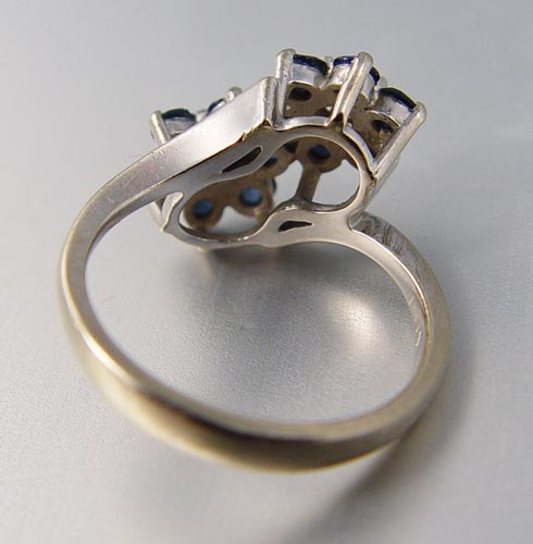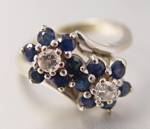 18K DIAMOND & SAPPHIRE RING: 14K white gold ring contains 2 round brilliant cut diamonds. Weight: .25 Ct. Approx. Rated VS in clarity and H-I in color. 12 round mixed cut sapphires. Weight: 1.00 Ct. Approx. The diamonds and sapphires are prong set. Weight: 4.0 grams. Size: 5.5