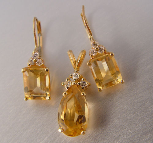 CITRINE & DIAMOND PENDANT AND EARRINGS: 1) 14K yellow gold pendant contains one pear mixed cut citrine. Weight: 2.50 Ct. Approx. 6 round full cut diamonds. Weight: .15 Ct. Approx. Rated SI-I in clarity and H-I in color. The citrine and diamonds are prong set. Weight: 2.6 grams. 2) 14K yellow gold earrings contain 2 emerald cut citrine. Weight: 4.75 Ct. Approx. 6 round full cut diamonds. Weight: .12 Ct. Approx. Rated SI-I in clarity and I-J in color. The citrine and diamonds are prong set. Weight: 3.1 grams.