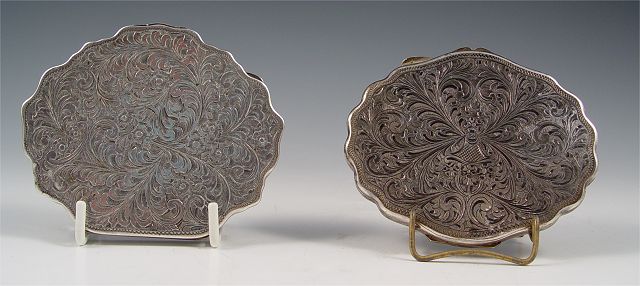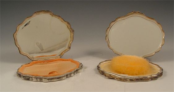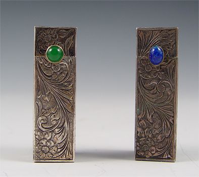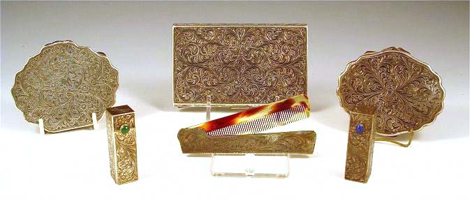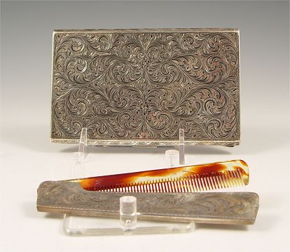 6 PIECES SILVER VANITY COLLECTION: All pieces similar but not identically engraved to include 1) Compact, measures 3 3/4'' x 3''. 2) Compact, 3 7/8'' x 3 1/8''. 3) 2 lipstick holders with pop up mirrors, one blue stone, one green, 2 1/4'' long. 4) Cigarette case 5 1/8'' x 3 1/4''. 5) Folding comb with shell appearance comb, 4 3/8'' long. Approx 13.2 troy oz 800 silver, note weighed with mirrors, comb. Note condition of comb.