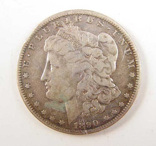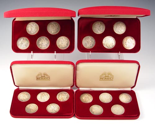 COLLECTION 20 MORGAN SILVER DOLLARS: Assorted dates from 1882-1899 many duplicate date. All show tarnish, have not been graded. Comes in sets of 5 in 4 display cases with certificate of authenticity from the National Monitary Center. Cases measure 1 1/2'' high x 7'' x 4 1/4'' each.