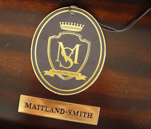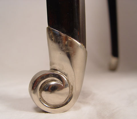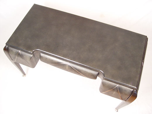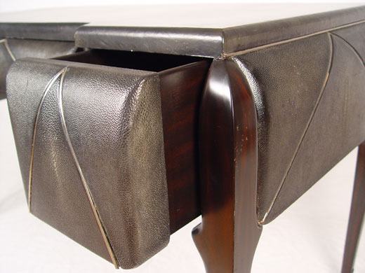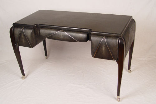 MAITLAND-SMITH FADED EBONY SHAGREEN DESK: Knee hole type desk, three drawers, faux shagreen clad with nickel plated trim and scroll feet. Model 5530-258, measures 52'' x 26'' x 30''.