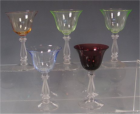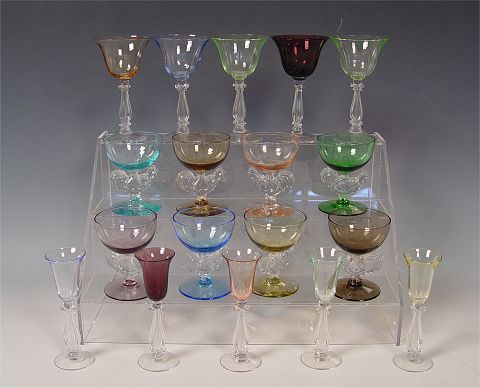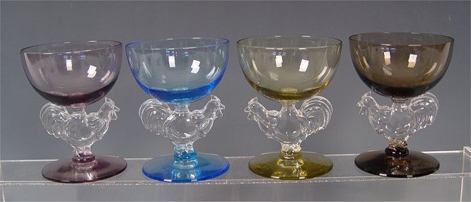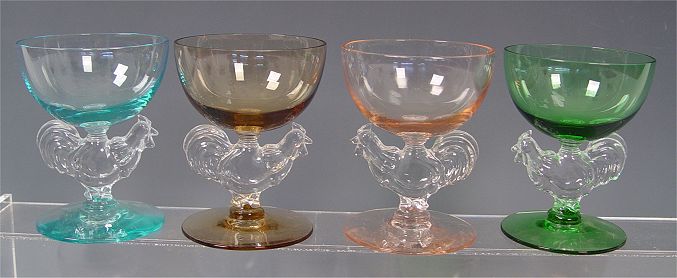 8 MORGANTOWN CHANTICLEER ROOSTER COCKTAIL GOBLETS PLUS: Set of 8 multi-color rooster base cocktail glasses, 3 3/4''h. Sold with 5 wine stems and 5 cordial stems of different pattern.
