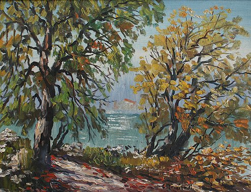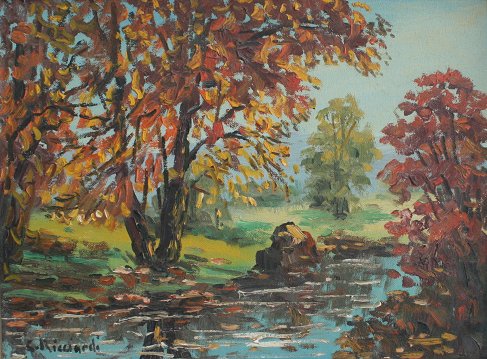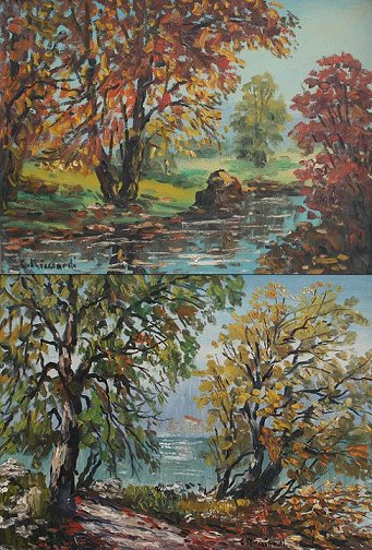 2 piece RICCIARDI, Caesare, (American, 1892-1988): Autumnal Stream Landscape, Oil/Canvas Board, 12'' x 16'', signed, painted frame 16'' x 20'' & Impressionist Lakeside Landscape, Oil/Canvas Board, 12'' x 16'', signed, encased in barn wood style frame 15'' x 19''.