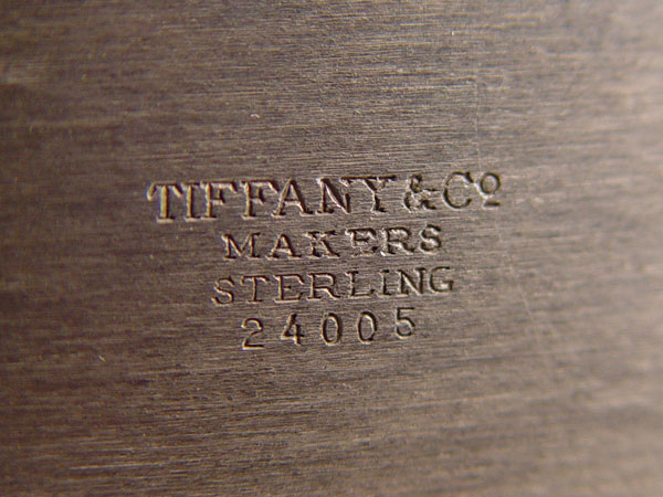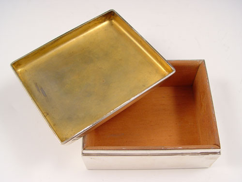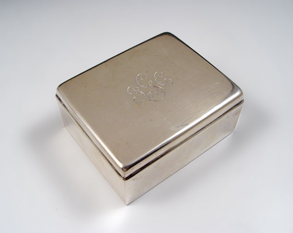 TIFFANY & CO. STERLING BOX: Wood inserts, marked on base Tiffany & Co. Makers Sterling 24005. Monogrammed. Measures 1 7/8'' high x 4 1/4'' x 3 1/4''. Approx 11.4 troy oz, note weighed with wood inserts.