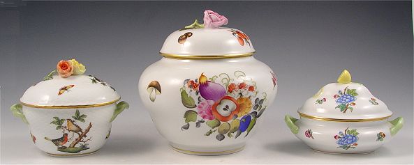 3 HEREND HANDPAINTED COVERED JARS: 1) Vegetable and fruit decorated covered jar with rose finial, 6 1/2'' tall. 2) Bird and butterfly covered dish with trio of roses finial, 4''h. 3) Butterfly and flower decorated jar with lemon finial, 3 1/2'' tall.