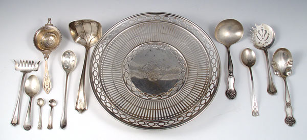 ESTATE COLLECTION OF STERLING PIECES: 12 pieces to include International silver reticulated footed tray, monogrammed, 9 3/8'' dia., other assorted serving and flatware pieces from Gorham, Whiting and other companies. Some monogrammed. Approx 15.3 troy oz.