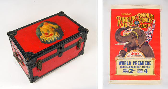 CLOWN TRUNK WITH CIRCUS POSTER: Steamer trunk with hand painted clown's head on top. Trunk on castors. Note overall condition, no lock. Also includes 1976 Ringling Brothers circus poster, note tears. Trunk measures 16 1/2'' high x 29 1/2'' x 19''.