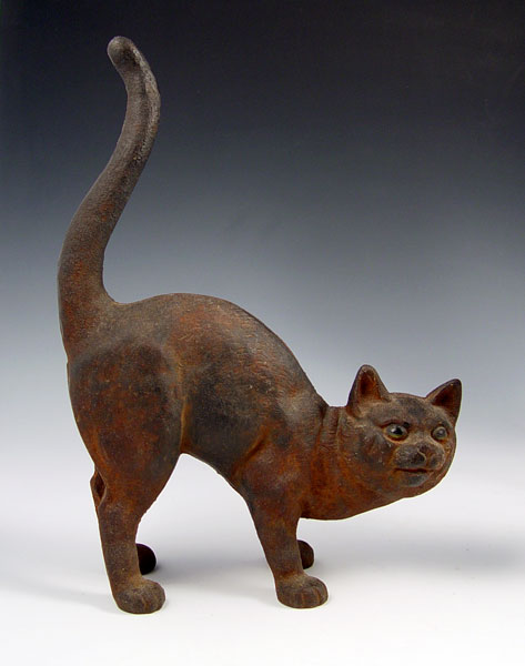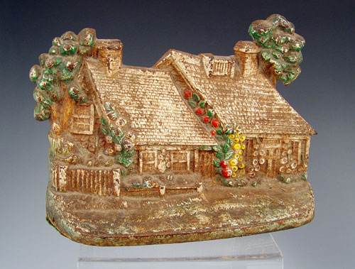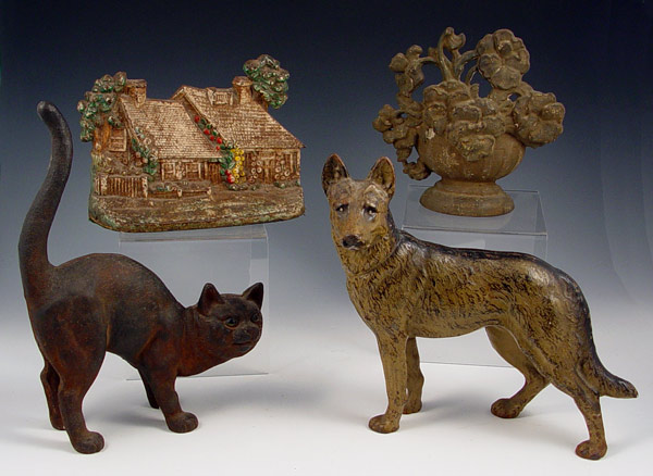 COLLECTION OF 4 HUBLEY DOORSTOPS: To include German Shephard (9 1/4'' x 10''), Hunchback Cat (10 3/4'' high x 8''), Pansy bowl #256 (6 1/2'' high x 6 3/4''), Cape Cod Cottage #444 (5 1/4'' high x 7 3/4''). Note overall condition.