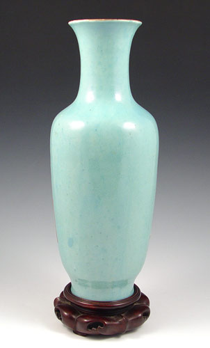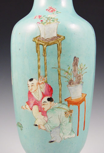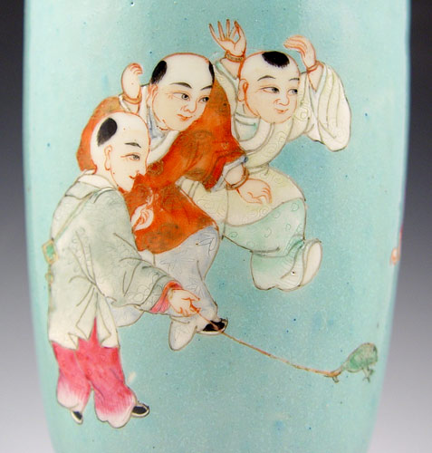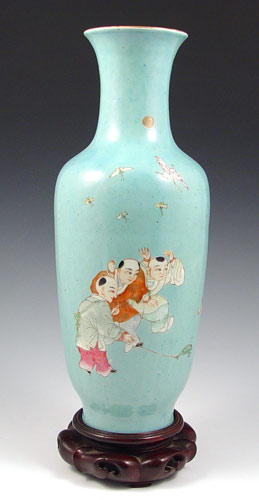 CHINESE AQUA COLOR CERAMIC VASE: Images of men playing with frog on a string. 11 1/2'' tall, excluding the carved wood stand. Signed in characters.