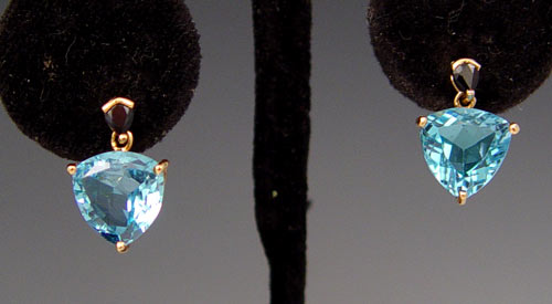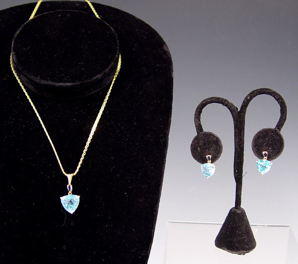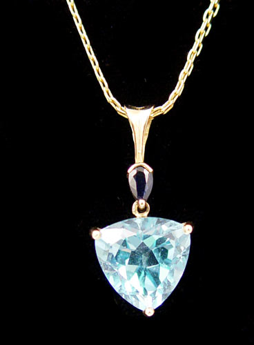 ESTATE BLUE TOPAZ AND SAPPHIRE SUITE: Matching pendant and earrings of yellow gold, marked Mexico 14k, set with trillion cut blue topaz accented by small pear shaped sapphires, 1 1/8'' pendant on a 20'' chain, marked 14k, earrings with post backs, approx. 5/8''l.