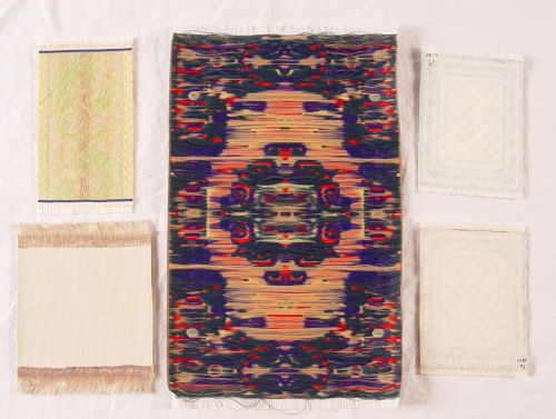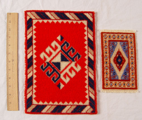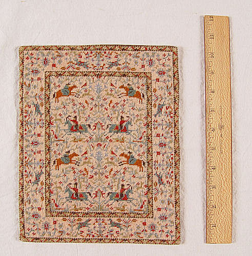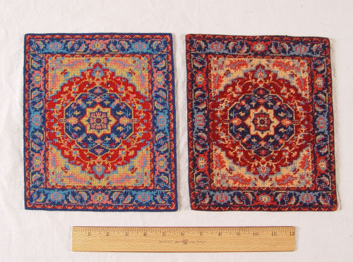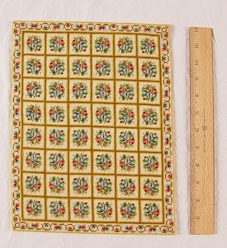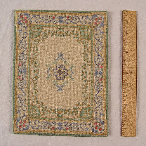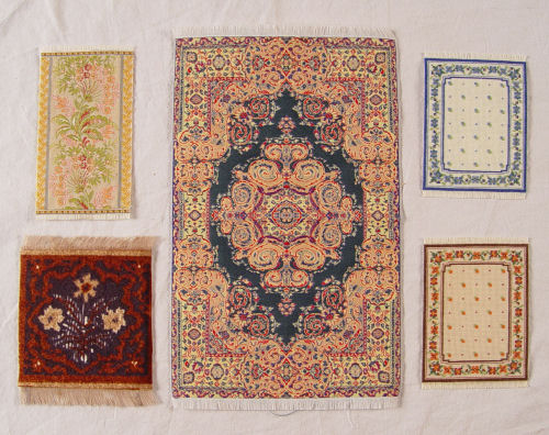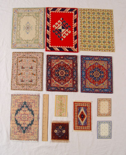 12 MINIATURE HANDMADE DOLL HOUSE CARPETS: Six are needlepoint and petit point worked by Justine Huhn. Represented are Tabriz, Savonnerie, and Heriz. They range is size from 12'' x 9'' to 9 3/4'' x 8 1/4''. The remainder 6 are made of brocade ribbon, petit point and fabric and are possibly commercial rugs. Smallest is 3 1/2'' x 4 1/2''.