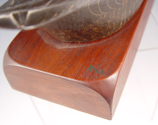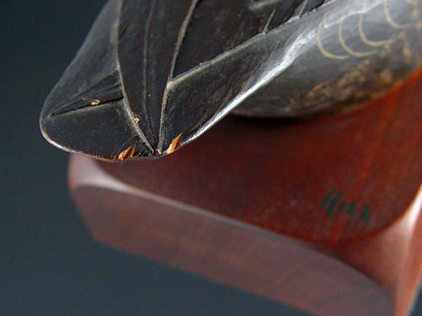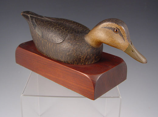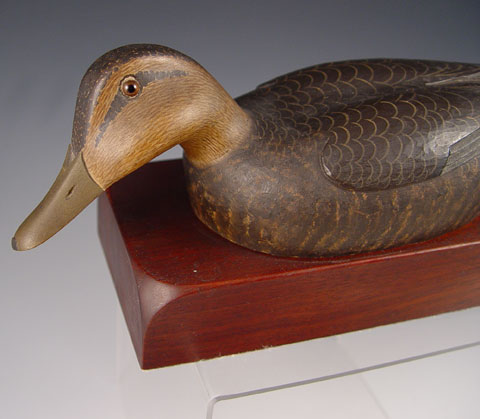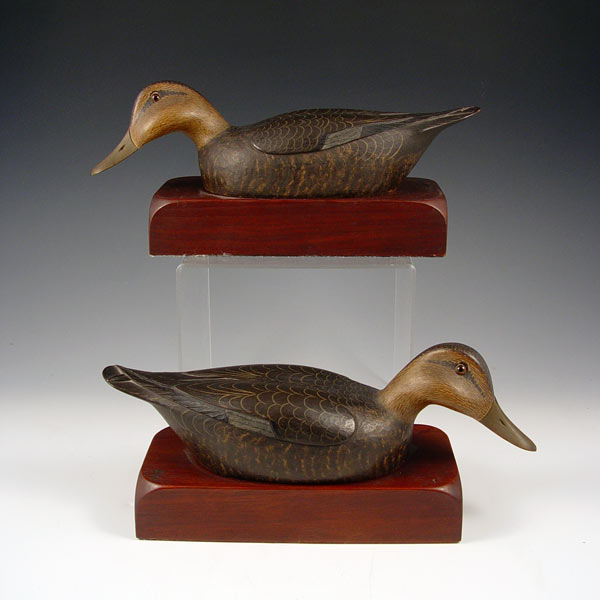 LEWIS W HILL CARVED BLACK DUCK DECOY BOOKENDS: Pair of finely carved and painted bookends by Dr. Lewis W. Hill. Signed Hill on top of base, Paper label on base reads Black Duck on Walnut, L. W. Hill. Measures 4 3/4'' high x 11'' long. Condition: Note 2 minor chips on tail of one.