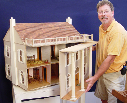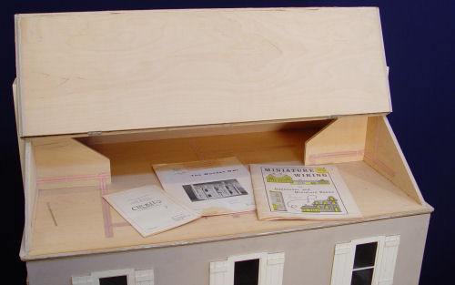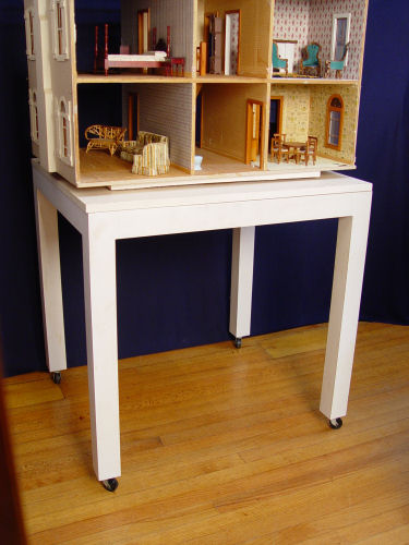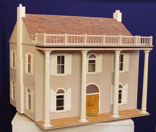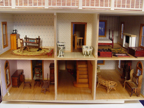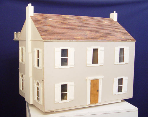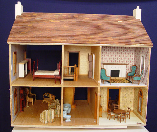 MINIATURE 10 ROOM DOLL HOUSE: The exterior featuring shingle roof, portico over the front porch, window with shutters. Interior is wall papered, and furnished. There are fireplace mantles, parlor and bedroom sets, lamps, and loads of kitchen accessories. Sold with the lazy susan table. This house is structurally sound but would enjoy an updated refurbishing. House measures 29 3/4'' high x 29 1/2'' x 33 1/2''. Stand with lazy susan top measures 33'' high x 28'' x 32''.