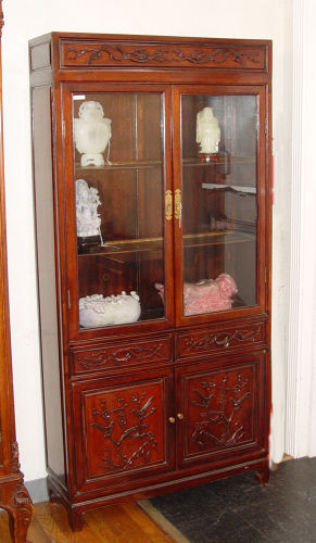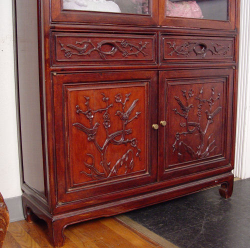 CHINESE CARVED CHINA DISPLAY CABINET: Tall front upper section with interior plate supports. Lower section with drawers over doors. Measures 74'' high x 36'' x 12''.