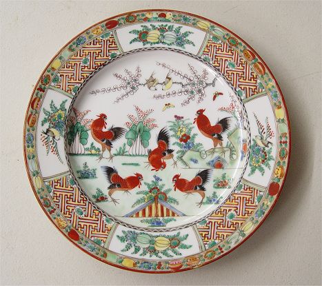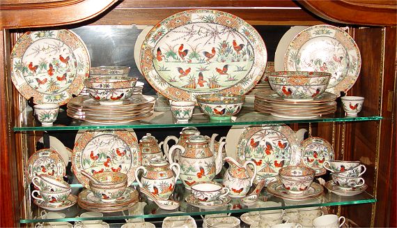 BRIGHTLY COLORED CHINESE PORCELAIN ROOSTER DECORATED CHINA: 49 pieces to include 12 dinner plates, 2 luncheon plates, 5 salad plates, 3 rice bowls, 4 soup bowls, 5 porcelain soup spoons, 6 cups with handles, 6 saucers, 3 handless tea cups, tea pot, cream pitcher, and sugar bowl.