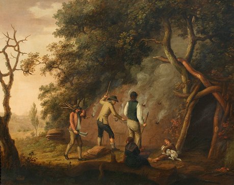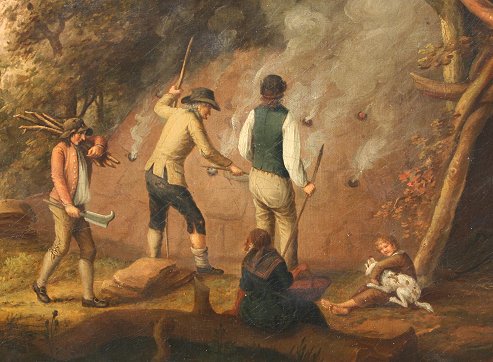 19TH C FOREST KILN PAINTING AFTER GEORGE MORLAND: OIL/Canvas, 19'' x 24'', no visible signature, encased in a gilded and carved gesso frame with minor wear, 23'' x 28''. Condition: Re-lined, scattered minor in-paint, needs cleaning, spider cracklure throughout.