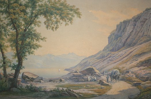 FINE 19th C EUROPEAN LANDSCAPE ILLEGIBLY SIGNED: Water Color, 12'' x 17 1/4'', depicts travelers along a lakeside valley trail with horse drawn cart and sailboat in the distance, illegibly signed? lower left, encased in period gilded and carved foliate motif frame with minor wear, 17'' x 22''. Condition: Some yellowing to paper. Est. $300/500**