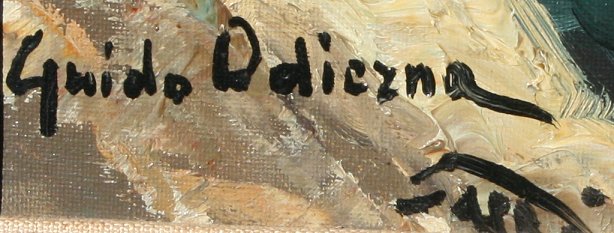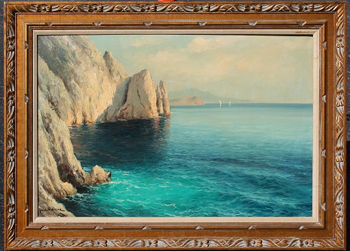 ODIERNA, Guido, (Italian, 1913-): Capri Coastal Scene, Oil/Canvas, 24'' x 36'', signed, carved frame, 32'' x 44'', signed verso. Guido Odierna (Italian, 1913-1991) was a painter who was born and lived in Capri, Italy. He studied in the Royal Academy and also in the studio of Alexander Garbastoff, one of the outstanding painters of Capri and the Bay of Naples area. After Garbatoff's death in 1940, Odierna, who was his best pupil, had taken over his place. His paintings depict different areas of the island, making up a large part of his body of work. He is known for working in oils that feature seascapes, landscapes, still lifes, flowers, coastal and fishing boat scenes. He also had a Gallery in Rome where he displayed and sold his own works along with other artists that he represented. (Source with permission from AskArt prior submission: The American Artists Bluebook Rex J. Goodwin submittal; and our internal records.) Meibohm Fine Arts excerpt Est. $500/800**