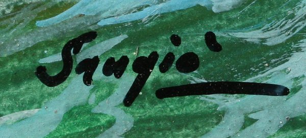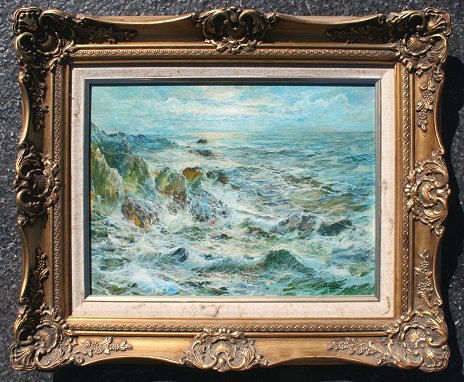 ILLEGIBLY SIGNED HIGHLY DETAILED COASTAL SURF PAINTING: Oil/Masonite, 11 3/4'' x 15 1/2'', carved and gilded frame, 19'' x 23''.