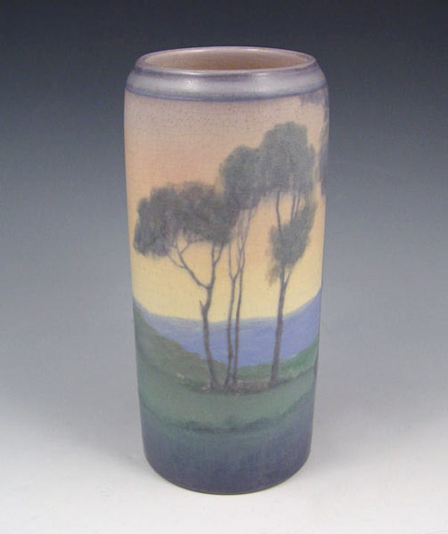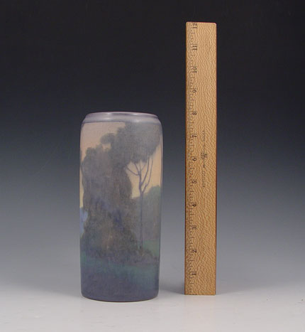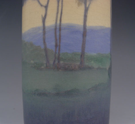 ROOKWOOD VELLUM SCENIC VASE BY CHARLES McLAUGHLIN: Impressed with the date mark 1915, shape 952E V for Vellum and Charles McLaughlin's artists mark. No chips or cracks, there is overall even crazing.