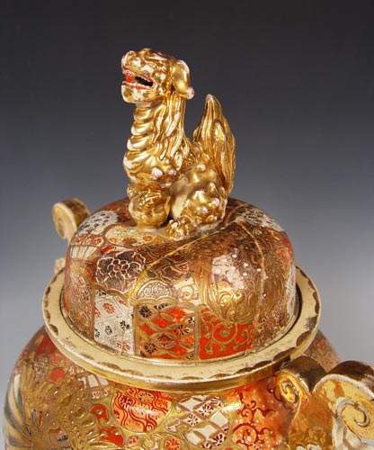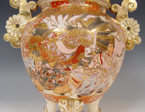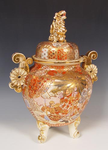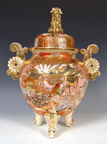 JAPANESE SATSUMA EARTHENWARE TRI FOOTED KORO: Heavily decorated featuring the foo dog finial. Natural wear to the gold. Measures 20'' high x 14 1/2''.