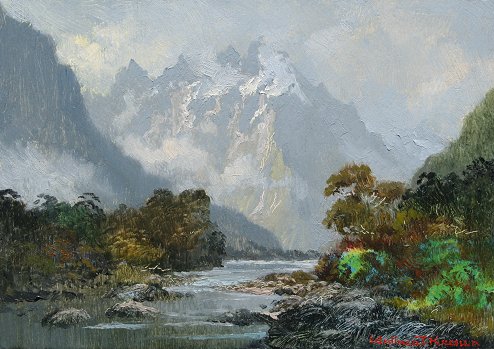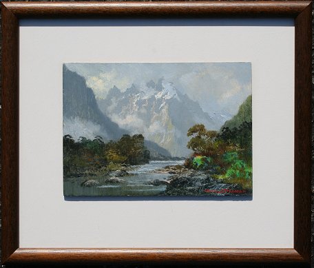 KEOWN, Wallace T., (Australian, 20th C): ''Lake Ada, Arthur Valley, Milford Track'', Mountain Landscape, OIL/B, 4 7/8'' x 6 7/8'', signed, titled verso, framed, 9 1/2'' x 11 1/4''.