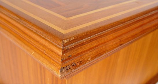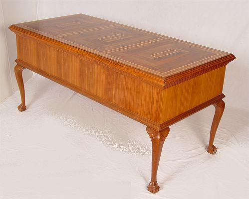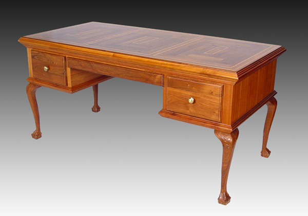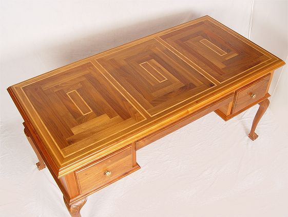 CONTEMPORARY PARQUETRY INLAY EXECUTIVE DESK: Mixed woods, three drawer desk, cabriole legs, generous work space. 31''H. X 63'' X 30''.