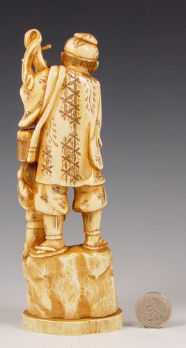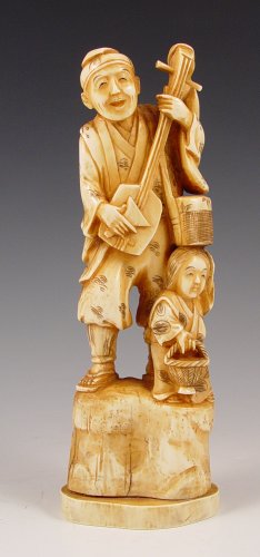 CARVED IVORY FIGURE MAN WITH INSTRUMENT GROUP: Figure on man with stringed instrument and small child with basket. Signed in characters on base. Measures 7 1/2'' high.