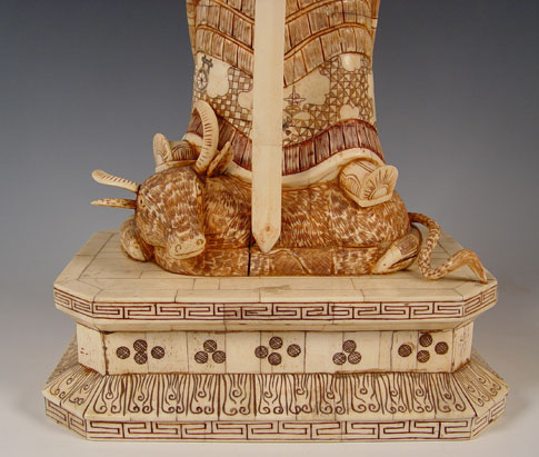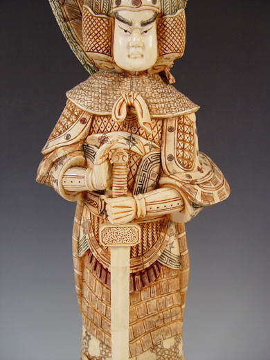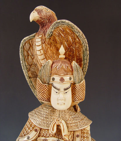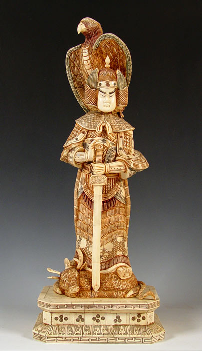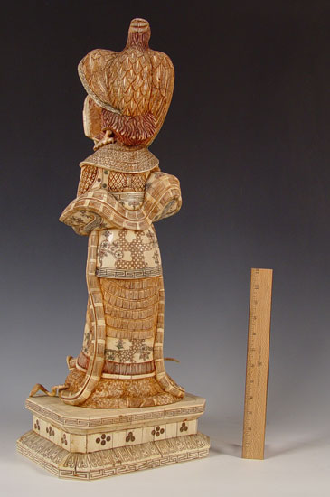 OVER TWO FEET TALL CHINESE CARVED AND CLAD BONE MALE WARRIOR WITH FALCON: 28'' high x 11 1/2'' x 8''