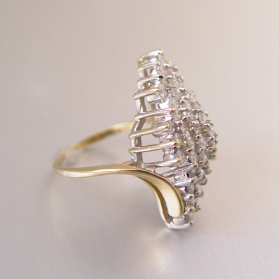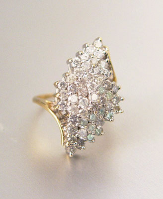 14K 2.00 CT DIAMOND RING: 14K yellow gold ring contains 49 round full cut diamonds. Weight: 2.00 Ct. Approx. Rated I2 in clarity and I-J in color. The diamonds are prong set. Weight: 6.7 grams. Size: 5.5