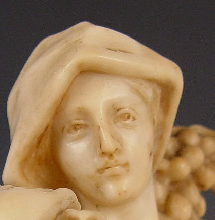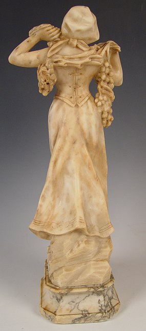 ''DATE PICKER'', ITALIAN ALABASTER SCULPTURE CIRCA 1900: 18''h. figure, 20 1/2''h. including marble socle, depicts a young maiden with her bounty of fruit, no visible signature. Condition: Repairs to base, several minor flecks throughout, good overall, repairs and chips to marble socle.