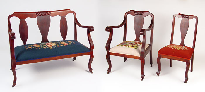 3 PIECE LATE VICTORIAN MAHOGANY PARLOR SET: All in custom floral needlepoint. Open arm SETTEE measures 34 3/4'' high x 45 1/2'' x 23''. Open ARM CHAIR, 25'' high x 23'' x 23'', SIDE CHAIR, 14 3/4'' high x 19'' x 19''.