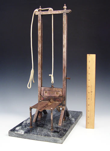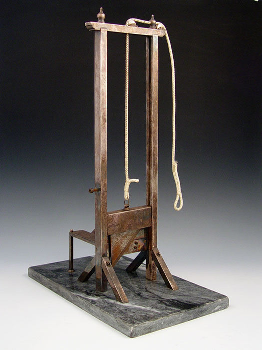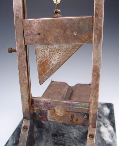 SILVERPLATE & MARBLE GUILLOTINE CIGAR CUTTER: Large guillotine form on marble base. Silverplate metal structure with weighted blade on tracks. Unmarked as to maker. Note blade will need cleaning & sharpening. Measures 20 1/2'' high x 14 1/4'' x 8 1/2''.