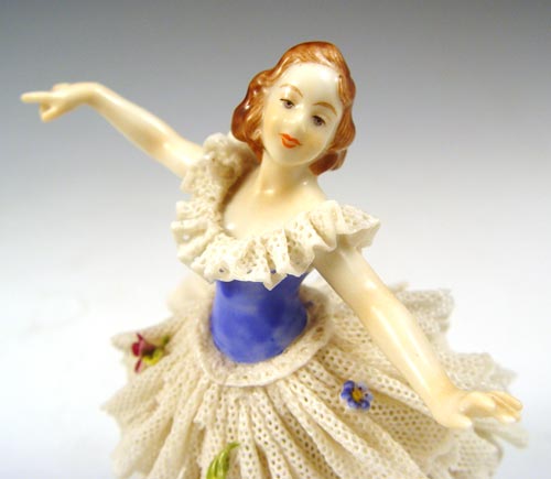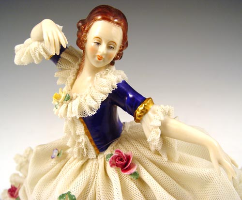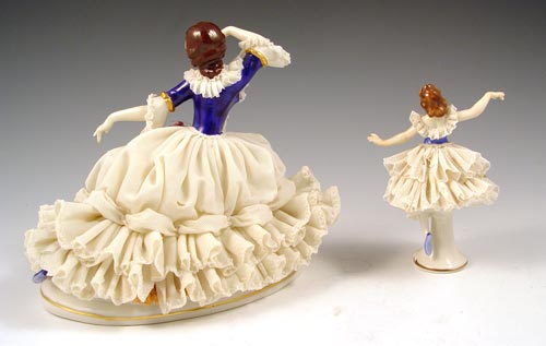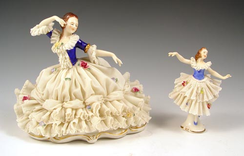 2 DRESDEN LACY FIGURINES: 1) The larger is Muller Dresden, 6''h. x 7'' long. 2) The smaller of the two is 4''h.