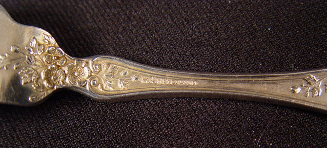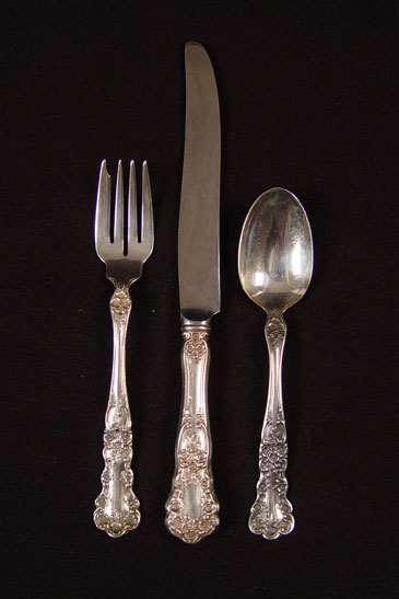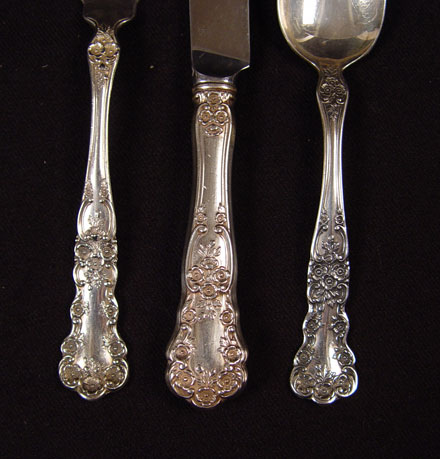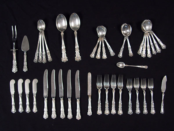GORHAM BUTTERCUP STERLING FLATWARE SET: 40 pieces by Gorham in the Buttercup pattern service for 4 to include 4 forks (7''), 4 salad forks (6 1/4''), 4 teaspoons (5 3/4''), 4 soup spoons (6 1/8''), 2 gumbo spoons (6 5/8''), 2 tablespoons (8 1/2''), 4 iced teaspoons (7 1/2''), spoon (6''), sugar scoop (5 7/8''), long handle spoon (5 1/2''), 5 hollow dinner knives (8 3/4''), hollow round knife (7 1/2'', monogrammed), master butter (6 3/4''), 4 butter knives (6''), pie server (6 1/2''), carving fork (8 1/2''). Approx. 42.1 troy oz.