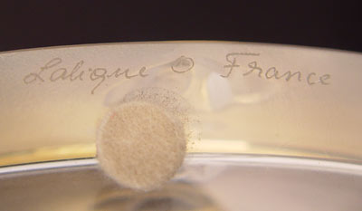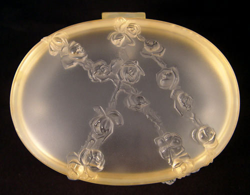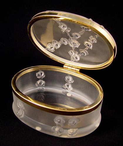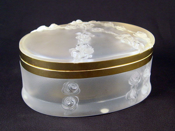 FRENCH LALIQUE CRYSTAL COVERED BOX: Roses in relief hinged oval box with rose vine design. Signed ''Lalique France''. 3'' high x 7''