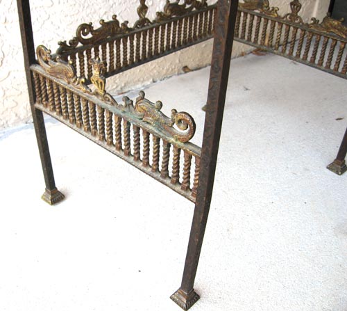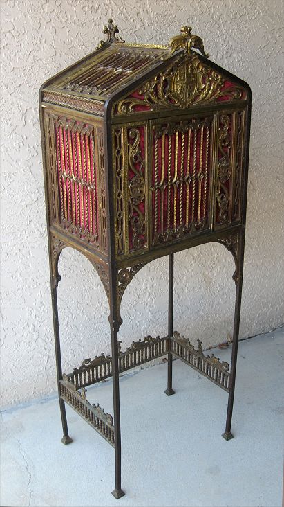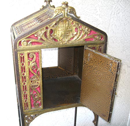 EARLY 20TH C WROUGHT IRON PHONE CABINET after OSCAR BACH: Reticulated cathedral type cabinet on legs. Original velvet lining and gilt finish. Measures 52 1/2 high x 18 1/2'' wide x 13 1/2'' deep.
