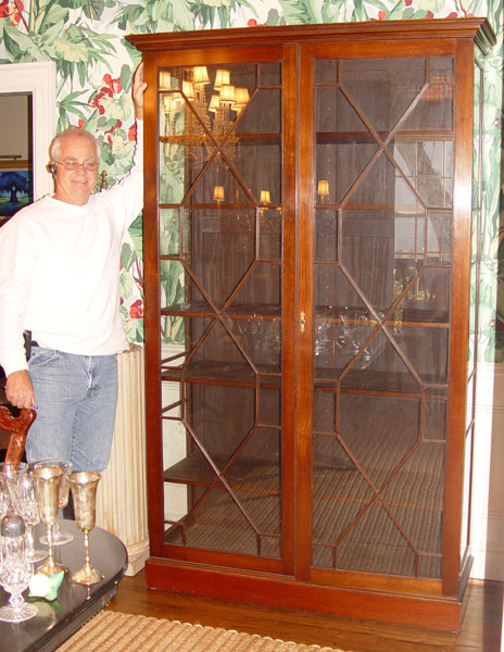 GEORGIAN STYLE 2 DOOR MAHOGANY BOOKCASE DISPLAY CABINET: Adjustable wood shelf interior. Measures 84 1/2 x high x 48'' wide x 16 3/4'' deep.