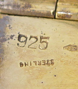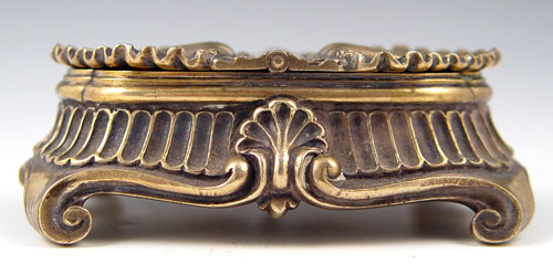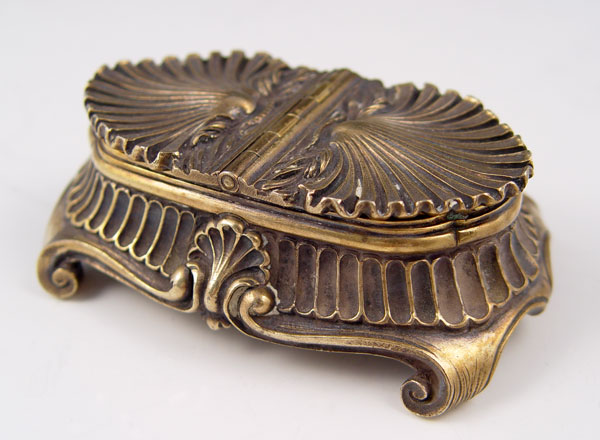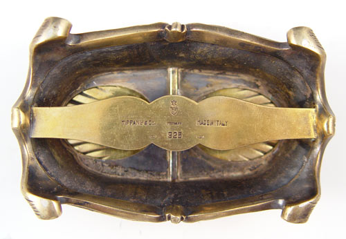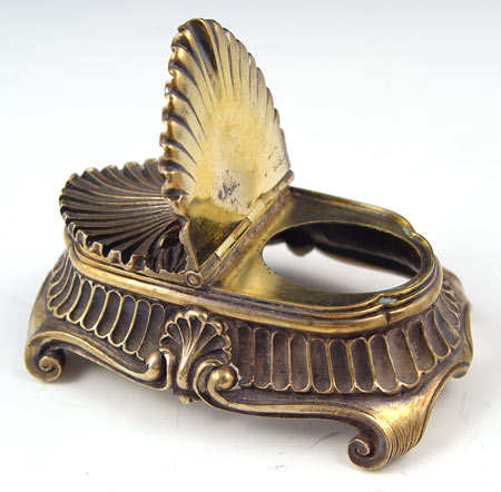 TIFFANY & CO. STERLING INKWELL: Shell form hinged double lid on 4 scroll feet. Marked Tiffany & Co. Sterling Made in Italy. Vermeil finish. Measures 1 3/8'' high x 4'' wide. Approx 8.3 troy oz.