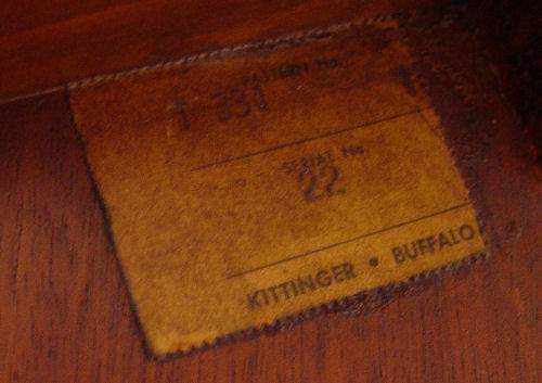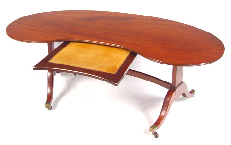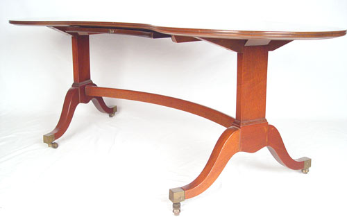 KITTINGER MAHOGANY COFFEE TABLE: Kidney shape top on double pedestal base, pull out leather top slide. Paper label. 19''h. x 51 1/2''l.
