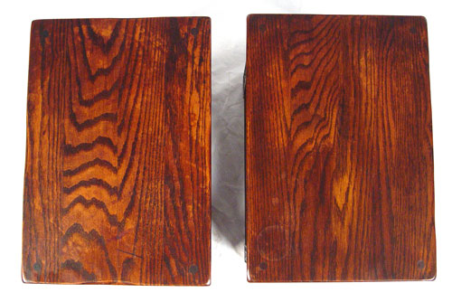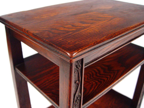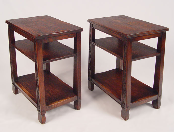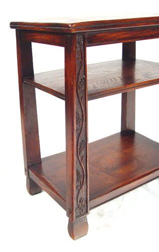 EARLY 20TH C ARTS & CRAFTS OAK CARVED OAK STANDS: 3 tier with relief grape vine carvings to legs. Impressed brand, unascribed. Measures 22 1/4'' high x 18 1/2'' wide x 11 1/2'' deep.