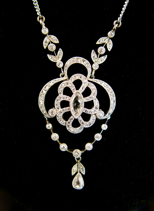 EDWARDIAN PLATINUM AND DIAMOND LAVALIER NECKLACE: Platinum necklace contains 119 round and irregular shaped rose cut and early round single cut diamonds, One early navette shaped diamond and one early pear cut diamond. TOTAL WEIGHT: 1.25 Ct. approx. The diamonds average VS-SI in clarity and I-J in color. 14K white gold (replacement) chain. Weight: 9.9 grams. No Reserve.