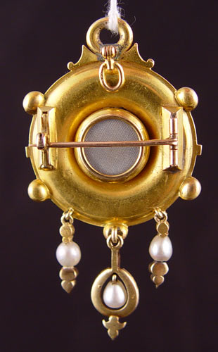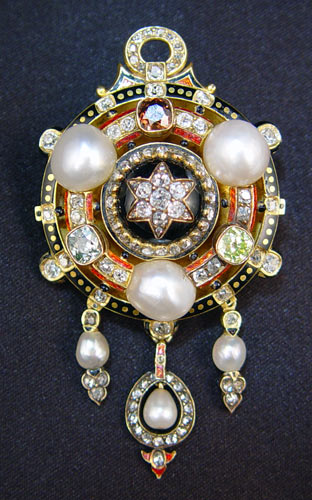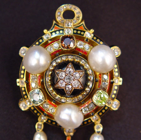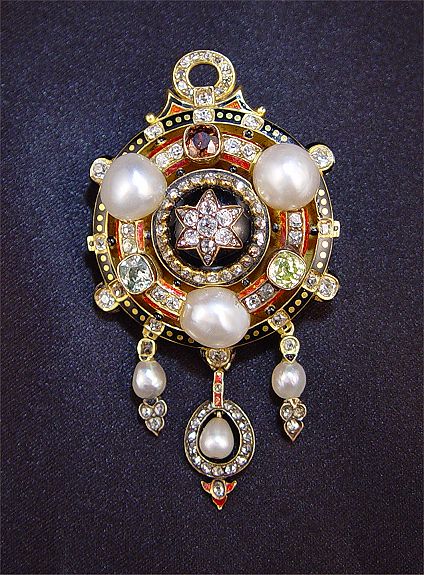 ANTIQUE 18K COLORED DIAMOND, PEARL AND ENAMEL BROOCH/PENDANT: 18K yellow gold brooch of colored diamonds, baroque pearls, rose and mine cut diamonds. Set in the center with a star of diamonds and featuring 3 cushion cut colored diamonds. One is approx. .50 Ct., rated I1 in clarity and reddish brown in color. The second is approx. .45 Ct., rated I1 in clarity and light greenish-blue in color. The third is approx. .45 Ct., rated SI1 in clarity and light greenish yellow in color. There are 33 old mine cut diamonds, approx. total weight 1.70 Ct., rated SI1-I1 in clarity and H-I in color. There are also 39 rose cut diamonds, approx. total weight .76 Ct., rated SI1-I1 in clarity and H-I in color. Then there are also 25 rose cut and old mine cut diamonds. TOTAL WEIGHT: .50 Ct. Approx. Rated SI1-I1 in clarity and H-I in color. Three baroque shaped pearls measure approx. 8.50-9.00 mm. Three drop shaped pearls measure approx. 6.00 x 4.50 mm. White in body color. Medium luster and slightly blemished. Bla