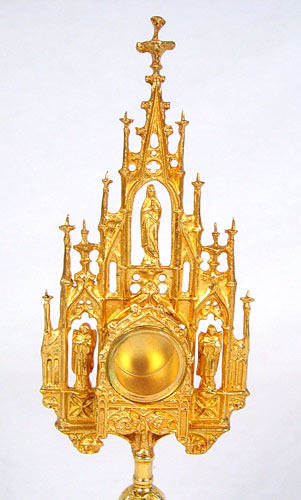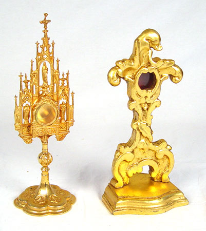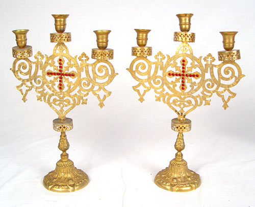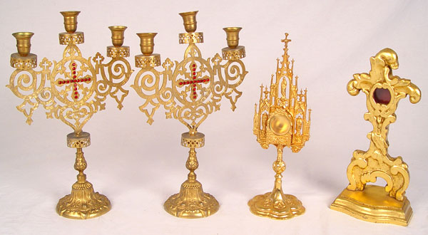 MONSTRANCE, RELIQUARY AND PAIR OF ALTAR CANDLE HOLDERS: To include 1) Gilt wood stylized cross measures 14'' high. 2) Cathedral monstrance with figures measures 15'' high. 3) Pair 3 light candelabra with green glass cross, red verso, measures 16 1/2'' high x 11 1/4'' wide.