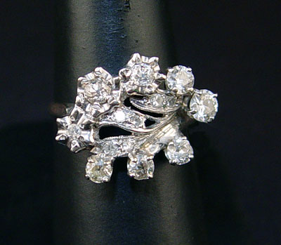 VINTAGE 14K DIAMOND RING: 14K white gold ring with 7 round single cut diamonds and old mine, round brilliant and old European cut diamonds. Weight: 1.33 Ct. Approx. The diamonds average VS-I1 in clarity and H-K in color. The diamonds are prong set. Weight: 4.4 grams. Size:8 No Reserve.