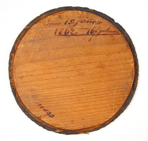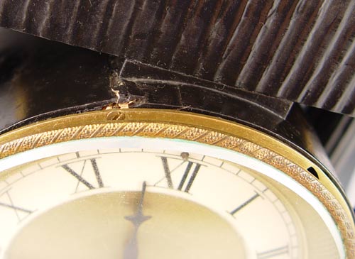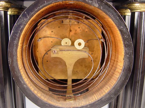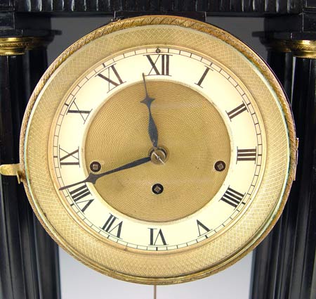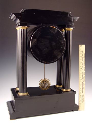 EMPIRE PORTICO MANTLE CLOCK GRAND SONNERIE MOVEMENT: Empire style black painted wood base, columns and pediment. Brass face with Roman numerals. Grand sonnerie, key and pendulum movement. Works unmarked as to maker, hand written illegible German name with 1862 date inside rear panel. Measures 17 1/2'' high x 12 1/2'' wide x 5 7/8''. Note pendulum repair, replacement key.